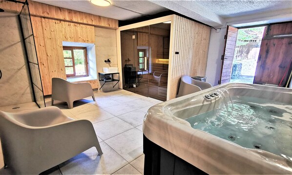 Unser Landhaus verfügt über ein eigenes Spa mit einer großen Sauna und einem Jacuzzi, von dem aus Sie direkt in unseren 2000 m2 großen Naturgarten gelangen. Das Haus liegt eingebettet in einem winzigen Dorf, von dem aus Sie in alle Richtungen die Gegend in langen Wanderungen oder Radtouren erkunden können.