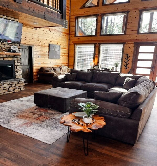 Imagine waking up in a soft, king-size bed as the morning sun pours through tall windows and the gentle sounds of the forest stir you from sleep. Step into your spa-like bathroom for a rejuvenating shower or soak in the deep tub before wandering into the great room. The grand stone fireplace crackles to life, the towering ceilings invite a deep breath, and the smell of fresh coffee brewing in the fully equipped kitchen makes its way through the lodge.