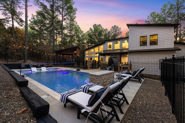 Step outside, and you’re greeted by your private resort-style backyard. Imagine relaxing in the custom-designed heated saltwater pool (separate heating fee) with a shallow ends to deep middle design perfect for water volleyball, lounging on the tanning ledge as you soak in the sun, or marveling at the pool’s multi-colored lights and waterfall that set a dreamy ambiance after dark. Take on a challenge at the pickleball and basketball court, cornholes, or let your competitive spirit shine in a game of glow 6-hole golf among towering pines.