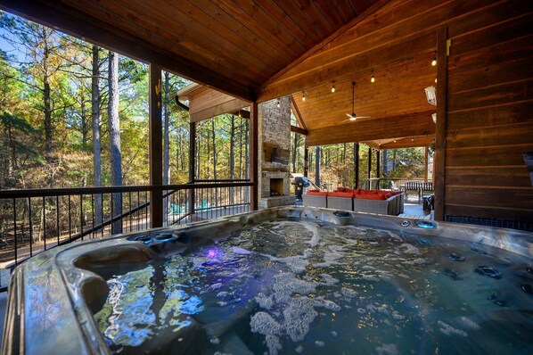 This cabin boasts an Outdoor Oasis with 1000 Sq. Ft. Covered Deck complete with a six-person hot tub, cozy sectional seating, gas fireplace, flat-screen TV, and an additional dining area. Stay cozy with outdoor heaters or cool off with the industrial fan.