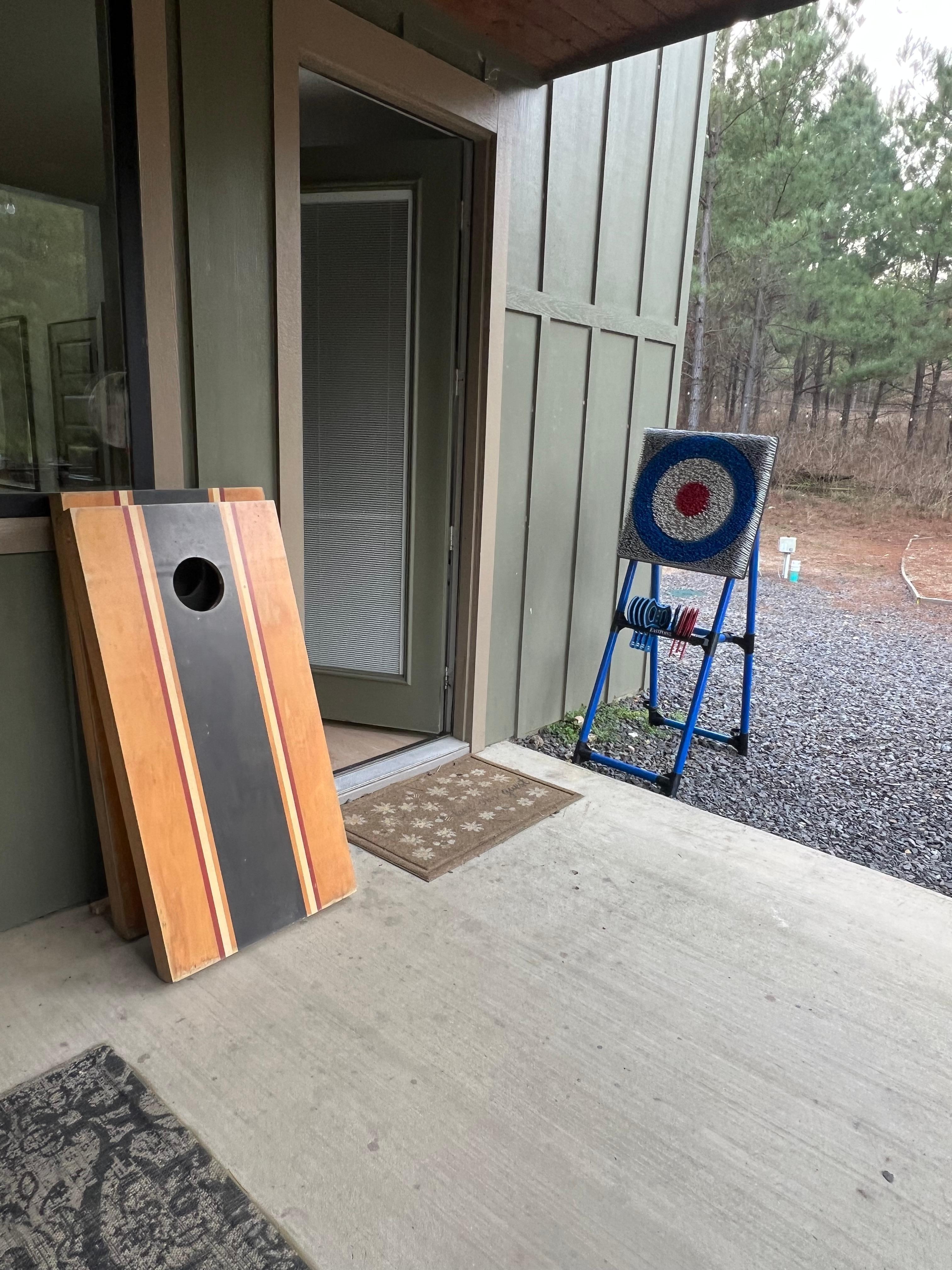 This is outdoor living at its best. Cook some burgers or hot dogs on the BBQ grill. Enjoy them with a few drinks, while listening to the sound of the birds in the tall pines. Even enjoy a game of axe throwing (yes, I said axe throwing) & conrhole. Don’t worry, it is safe for kiddos. Cozy up by the outdoor fireplace and turn on an outdoor movie on the large outdoor smart TV. We have a variety of swings and chairs around the firepit as well as large oversized hammock net for stargazing.