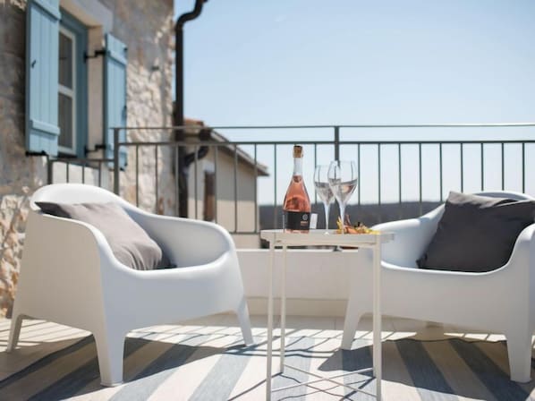 3-Zimmer-Reihenhaus 120 m2 auf 2 Stockwerken im 1. Stock. Schön und geschmackvoll eingerichtet: Wohn-/Esszimmer mit Sat-TV (Flachbildschirm), Klimaanlage. Ausgang zur Terrasse. Offene Küche (Geschirrspüler, 4 Induktionskochplatten, Toaster, Wasserkocher, Tiefkühler, elektrische Kaffeemaschine). Dusche/WC. Obergeschoss: 1 Zimmer mit 1 franz. Bett (160 cm, Länge 200 cm). 1 Zimmer mit 2 Betten (90 cm, Länge 200 cm), Klimaanlage. Abgeschrägte, offene Galerie, Deckenhöhe 60 - 200 cm mit Dachfenster mit 1 Doppeldiwanbett (120 cm, Länge 190 cm). Dusche/WC. Bodenheizung (extra). Terrasse 10 m2, Terrasse 16 m2. Terrassenmöbel, Gartengrill (mobil), Liegestühle. Fernsicht auf das Meer. Zur Verfügung: Haartrockner. Internet (Wireless LAN, gratis). 1 kleines Haustier/Hund erlaubt. 2163/1-10/2-21-3 klasa:UP/I-335-03/21-01/1860