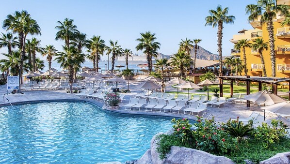 Villa del Palmar Beach Resort & Spa is an optional Cabo San Lucas all inclusive resort that is perfect for family getaways and romantic couple retreats. Located on Médano Beach in Cabo Mexico, just one mile from downtown, our exquisite resort offers the ultimate in lively entertainment, family-friendly activities, outdoor swimming pools, beachfront Jacuzzis, and world-class service.