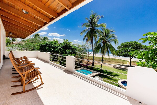 Casa Mirage ist eine bezaubernde und einladende mehrstöckige Villa direkt am Meer, die sich auf dem unberührten weißen Sandstrand von Playa Grande befindet. Einzigartig gelegen, ohne Weg zum Gehen, Straße zum Überqueren oder grüne Mauer, die den Blick auf das Meer versperrt. Dieses Ferienhaus im mediterranen Stil ist attraktiv aus einheimischen Harthölzern gebaut. Die Möbel sind modern, farbenfroh, komfortabel und viele individuell. Die Zimmer auf der oberen Ebene bieten einen unberührten Blick auf den Strand. Die Zimmer auf der unteren Ebene öffnen sich in einen lebhaften Gartenhof. Terrazzofliesenböden fließen durch das Innere und breiten sich über die weitläufigen Veranden mit Blick auf den Strand aus.