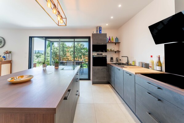 Mas Mayflower bietet Ihnen ein sehr großes, helles Wohnzimmer mit Zugang zu einer riesigen Terrasse, geschützt durch eine bioklimatische Pergola. Eine an die Küche angrenzende Waschküche und ein separates WC vervollständigen das über 100 m² große Erdgeschoss, das komplett klimatisiert und mit Fußbodenheizung für optimalen Komfort ausgestattet ist. Im Obergeschoss, nach Süden ausgerichtet, befinden sich eine Elternsuite mit Ankleide, Bad mit Dusche und WC, zwei große Schlafzimmer, ein Badezimmer mit Badewanne und ein separates WC. Fußbodenklimatisierung, neue 160x200-Betten, bereitgestellte Bettwäsche und viel Stauraum sorgen für einen angenehmen Aufenthalt. Direkt an der Terrasse lädt ein 7,5 x 3,5 m großer Pool (hydrolysebasiert, pH-Regler, chlorfrei) und ein bewachsener Garten zur Entspannung ein. Hängematte unter Eichen, Liegestühle sowie Parkplätze im Hauspark oder am Chemin des Cabanes stehen Ihnen zur Verfügung. Ruhe garantiert!