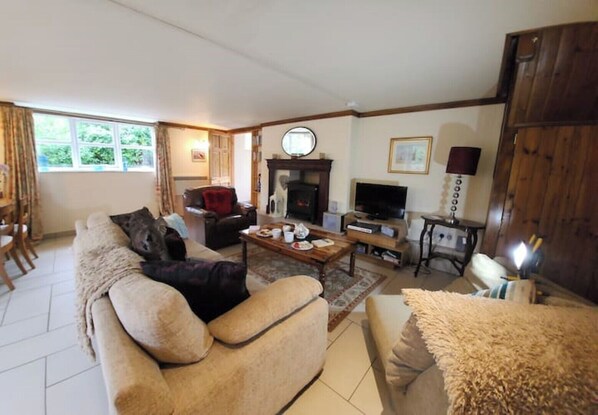 The living area, is large, open and light, and has tiled flooring, so slippers would be useful to bring; The open wooden stairs go up from this room to the bedrooms. The stylish, oak kitchen is well equipped and has everything you need, and is to one side and living area. To the other side is the sitting area with lovely fireplace, and plenty of seating with a very large sofa and two arm chairs.There is a flat screen free view television, books, dvds, tourist info, music cds, and wi fi, for your entertainment. The dining table is behind the sitting area and next to patio door it sits. All furnishings are to a high standard.