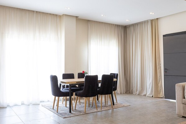 Living Area: A comfortable and stylish seating area with a sofa bed, Smart TV, and dining table for group gatherings. Large windows provide beautiful garden and pool views, creating a bright, relaxing atmosphere. Private Pool & Garden: Step outside to enjoy the villa’s private swimming pool and a spacious 130 sqm garden—perfect for relaxing, sunbathing, or having a BBQ in your own private oasis. Bedroom Layout: Two master bedrooms with king-sized beds and en-suite bathrooms. One bedroom with two single beds, ideal for kids or friends. One additional bedroom with a king-sized bed, featuring garden and pool views. Bathrooms: Four modern bathrooms with hot showers, complete with complimentary shower gel, hand soap, and fresh towels. Kitchen: A fully equipped kitchen with a refrigerator, gas stove, deep freezer, microwave, kettle, and all necessary cookware and dinnerware. Perfect for preparing meals during your stay. Outdoor Space: The villa features a private rooftop balcony with open views, ideal for enjoying morning coffee or evening relaxation by the pool. Access: Check-in starts at 3 PM, and check-out is by 11 AM. Arab or Egyptian couples must provide an official marriage document upon check-in. All guests are required to send their passports before arrival. No outside visitors are allowed to ensure a peaceful and private stay.