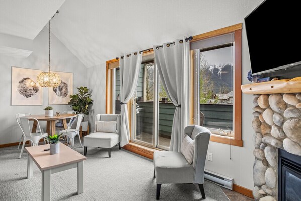This entire unit has been beautifully furnished and decorated to create a cozy, but bright mountain lodge feel. From the ambiance cast by the jute chandelier, the mixture of knit textures, to the vintage mountaineering photos, this place is sure to wow you during your stay.