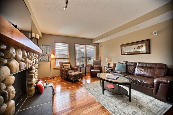WOHNZIMMER: Ledersofa mit einer kuscheligen Decke zum Aufwärmen, während Sie Ihre Lieblingshockeymannschaft auf einem 52-Zoll-Flachbildfernseher beobachten. Zwei gemütliche Stühle mit Ottomanen sowie ein Gaskamin. Die Wohnung verfügt über geothermische Heizung und Kühlung