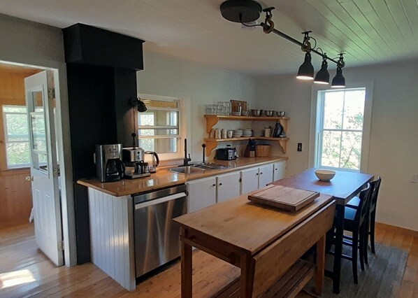 bequem und erschwinglich für eine Gruppe von bis zu sieben Gästen. Verfügt über ein Vollbad im Erdgeschoss, ein Halbbad im Obergeschoss, 4 Schlafzimmer (1 Queensize-Bett, 2 Doppelzimmer, 1 Einzelbett mit neuem Kinderbett), ein Esszimmer und ein Wohnzimmer, eine voll ausgestattete Küche, eine große sonnige überdachte Veranda an der Vorderseite, eine ruhige abgeschirmte und verglaste Veranda an der Rückseite. Holzboden im gesamten. Waschmaschine, Trockner und Wäscheleine, Geschirrspüler. Alle Bettwäsche geliefert. Lagerfeuer, Spiele, Puzzles, BBQ. Highspeed-Internet und Ferngespräche nach Kanada und in die USA enthalten. Bereich
