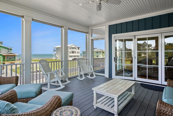 “Sunset’s” bright and airy open floor plan flows from the ample game room downstairs to the huge screened-in deck above, making it easy to access everything in between. Spacious rooms throughout gives everyone some extra elbow room to enjoy quiet reading or family game nights. The extra-large open deck, connected to the great room is one of our favorite areas of this home and offers plenty of versatile space for your entire group.