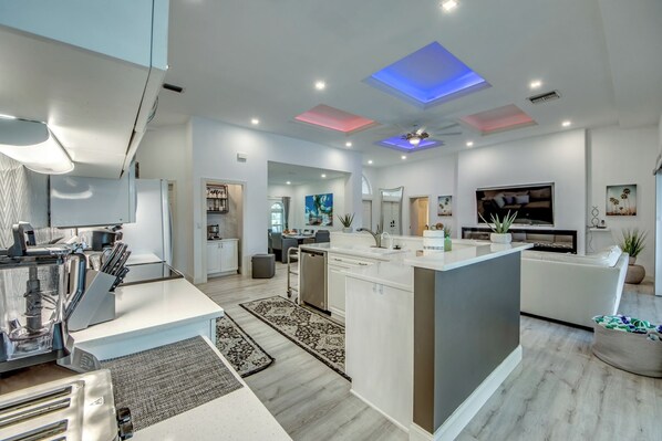 Outside, a grand saltwater pool with a length of appr. 45ft awaits within its screened enclosure – an oasis that epitomizes the famed Florida outdoor living experience. Embrace year-round enjoyment as you bask in the sun-dappled waters or sizzle up delights on the fantastic 4-burner propane gas grill provided for your convenience.