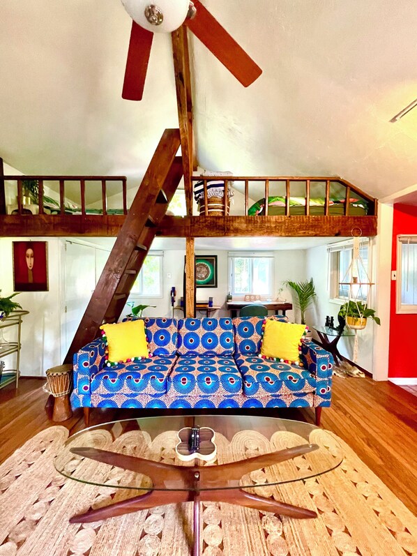 This charming Adirondack-style cabin is nestled in nature and thoughtfully decorated with unique, artful treasures from around the world, creating a soulful, cozy space for rest and reconnection. Inside, enjoy a living room with cathedral ceilings, a fireplace for fire-lit evenings, and a sleeping loft that adds warmth and character.