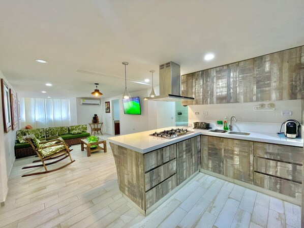 This property is located in the exclusive El Laguito neighborhood of the city of Cartagena. In the main room you will find a comfortable King bed and furniture, in the secondary room a Queen bed and in the third one a King bed and two single beds, all with a private full bathroom and a social bathroom. The building has an elevator with a maximum capacity of 2 people.
