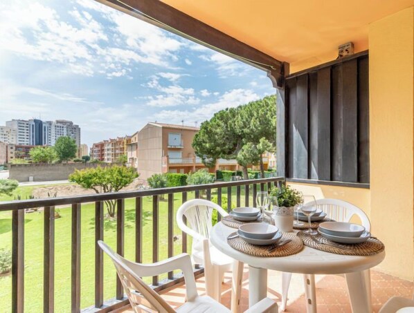 4-Zimmer-Wohnung 49 m2 im 1. Stock. Einfach und komfortabel eingerichtet: Wohn-/Esszimmer mit 1 Diwanbett, Digital-TV und Flachbildschirm. Ausgang zum Balkon. 1 Zimmer mit 1 franz. Bett (135 cm). 1 Zimmer mit 2 Betten (90 cm). 1 kleines Zimmer mit 1 x 2 Etagenbetten (90 cm, Länge 190 cm). Offene Küche (4 Kochplatten, Backofen, Mikrowelle, Tiefkühler, elektrische Kaffeemaschine) mit Bar. Dusche/WC. Keine Heizmöglichkeit. Balkon. Schöne Sicht auf den Garten. Zur Verfügung: Waschmaschine. Internet (WLAN, gratis). Parkplatz Nr. 9 (überdacht), Höhe 2 cm, Breite 3 cm. Bitte beachten: TV nur ES. HUTG013893 // Reg. Nr.: ESFCTU00001702000061097900000000000000000HUTG-0138931