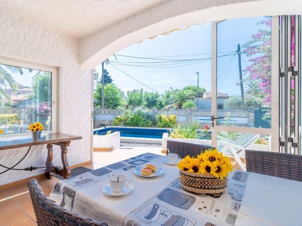 Gemütliches, komfortables Haus "D´Ibis". Im Ortsteil Pení, 500 m vom Zentrum von Empuriabrava, sonnige Lage im Villenviertel, exzellente Lage: Absolut zentral und dennoch ruhig, verkehrsberuhigte Zone, 900 m vom Meer, 200 m vom Kanal, Richtung Südwesten. Zur Alleinbenutzung: grosser, gepflegter Garten 250 m2 (eingezäunt) mit Blumen und Bäumen, Schwimmbad (8 x 4 m, 165 cm tief, saisonale Verfügbarkeit: 01.Jan. - 31.Dez.). Aussendusche, Pergola, Terrasse, Gartenmöbel, Grill, Parkplatz auf dem Grundstück. Einkaufsgeschäft 200 m, Supermarkt 800 m, Einkaufszentrum 500 m, Restaurant 120 m, Bar, Café, Bushaltestelle 800 m, Bahnstation 15 km, Sandstrand "Empuriabrava" 900 m, Tauchzentrum 200 m. Sporthafen 2 km, Golfplatz (9 Loch) 5 km, Tennis 2 km, Minigolf 290 m, Sportzentrum 1 km. Nahe gelegene Sehenswürdigkeiten: Parque acuático Roses 10 km, Centro Aeródromo y túnel del viento 2 km, Castillo de Perelada 12 km, Museo Dalí de Figueres 15 km, Ruïnas de St.Martí de Empúries 21 km, Monasterio de Sant Pere de Rodes 23 km. Die Schlüsselübergabe findet bei der Agentur Interhome in Empuriabrava statt.