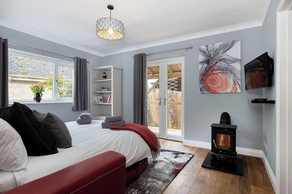 · Living room/Dining room: There is a large living/dining room with oak flooring, modern artwork, a wood burning stove, comfortable seating for 8, an extending dining table for 8 and a Smart TV. There are 2 sets of patio doors opening onto terraces in the enclosed garden where you will be able to enjoy alfresco drinks and meals.