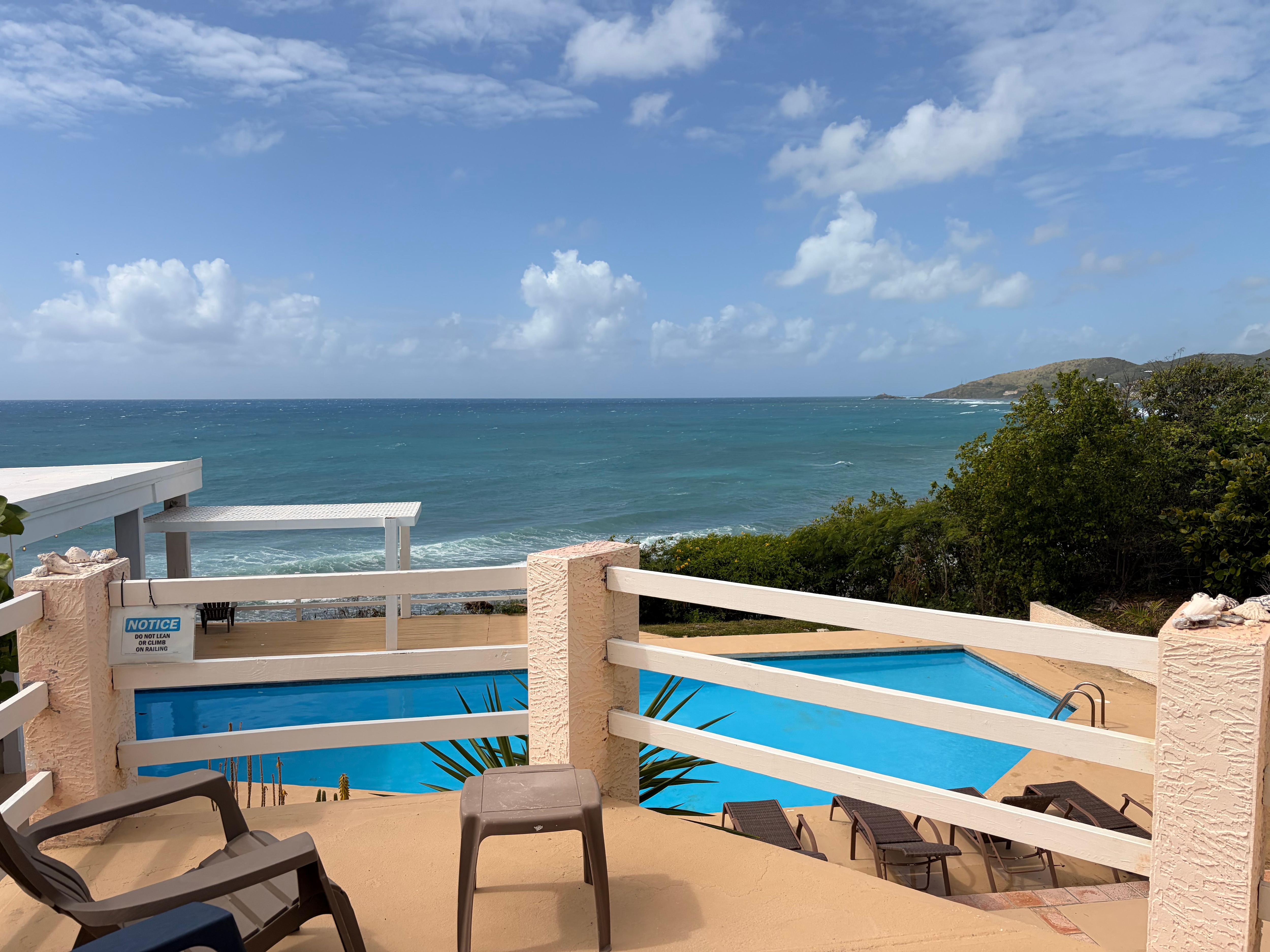 Incredible waterfront location for this large 5 bedroom rustic home on the sparkling shore of the Caribbean Sea. Walking distance to a nearby beach and the Nature Conservatory's Jacks & Issac's Bay. A wall of windows for water views, year-round trade breezes and the soothing sound of waves from the shoreline below make for a unforgettable stay. Olympic style 50' seaside pool is delightful after a kayak or snorkeling excursion down in front.