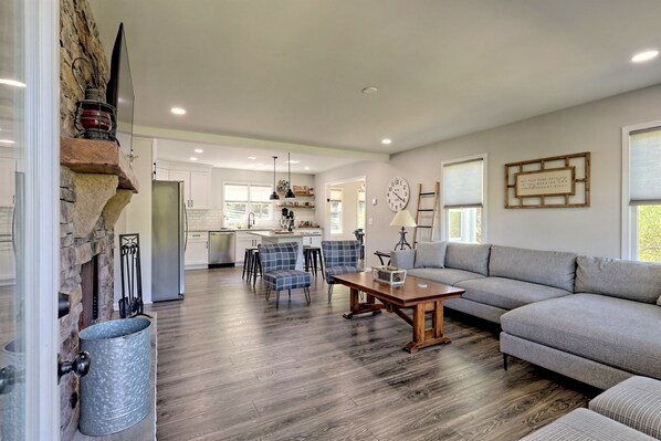 -Step into a sun-filled great room anchored by a stunning stone, wood-burning fireplace and a 50” Smart TV. The open-concept layout flows effortlessly into a fully stocked gourmet kitchen featuring stainless steel appliances, a large island, and everything needed for meals at home.