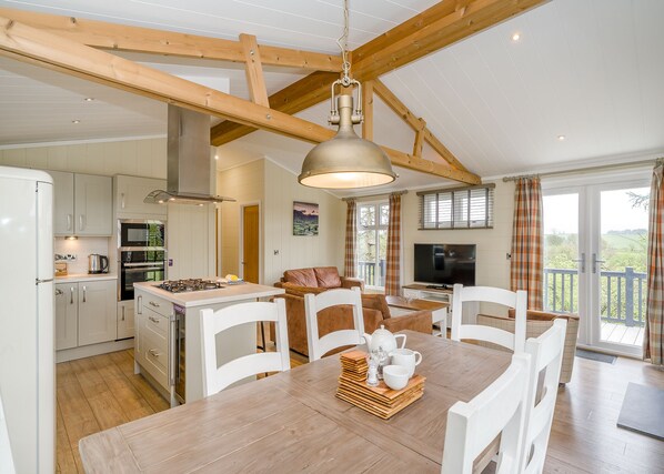 This luxurious lodge is ideal for a relaxing break with friends or family. Featuring an open-plan living space with large windows letting the light flood in, comfy sofas, Flatscreen TV, stylish kitchen with breakfast bar and elegant family dining area. The two spacious doubles feature contemporary en suite bathrooms, well-sized twin and family bathroom with bath and overhead shower. The French doors lead to outdoor decking area perfect for enjoying the sun in the warmer months. Please note: If you are intending on bringing a pet with you, please select a pet using the pet filter during the booking process, as the resort must be made aware of this in advance. Pets allowed in selected accommodation only.