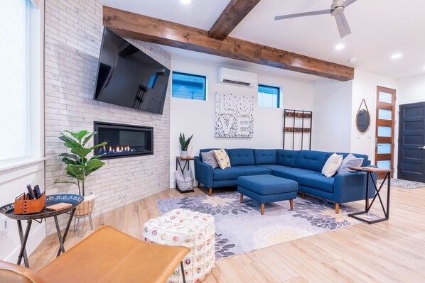 Master Bedroom: Located upstairs, featuring a cozy queen-sized bed, large closets, and an attached master bathroom for added privacy. The room includes a cadet heater, a ceiling fan, and a smart TV for streaming your favorite shows.