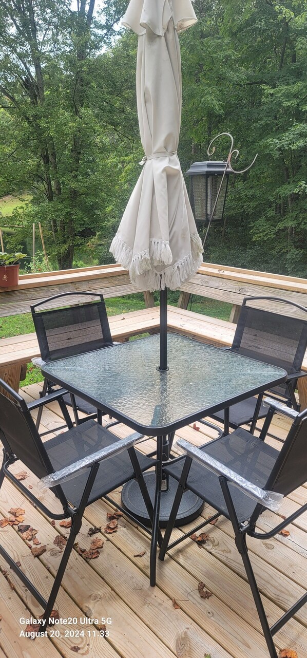 Glass top patio table with chairs and umbrella on back deck.