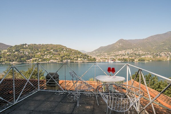 Elegant and bright flat on two levels in a portion of a period villa with private garden, large patio and panoramic terrace, able to accommodate up to 8 persons.Access is up two flights of stairs leading from the street to the property.Two bedrooms and a