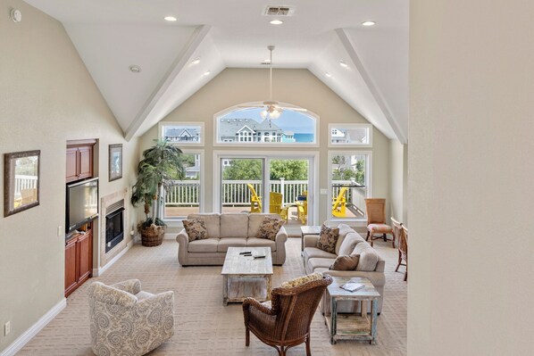 The tastefully appointed open-concept great room boasts an ocean view, vaulted ceilings and plenty of space for gathering. When you're not dining out at one of Corolla's fabulous restaurants, prepare meals at home in the kitchen featuring granite countertops and stainless steel appliances. Two generously sized king suites are located on the top level and each include a private bath. With five more bedrooms located on the mid-level (three of which are ensuite) and two more on the ground floor, this spacious retreat is ideal for multiple or extended families. Even the canine members of your tribe can join you since Mi Casa Bella is dog-friendly.