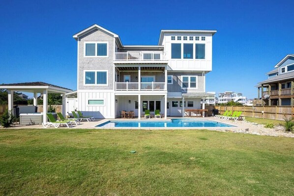 This is a large immaculate house a block off the beach within walking distance to old Corolla. Fully equipped kitchen, huge pool, new hot tub, nice great room. Couldn’t ask for much more.