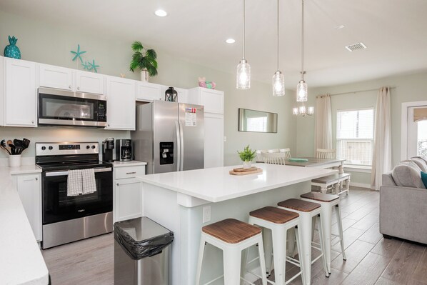 Fully equipped kitchen with stainless appliances and seating for 12