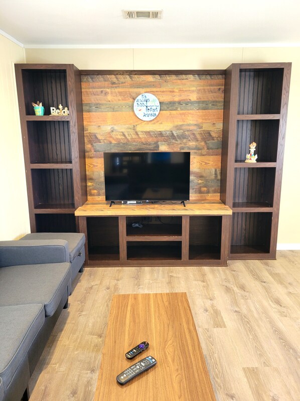Entering into the home you'll find a large living area with a sofa and futon couch suitable for 2 small children or 1 adult. It flows into a dining area and large kitchen. The kitchen features a gas stove, full size fridge, and microwave. It is stocked with pots, pans, and dining ware to cook a meal for yourself at home.