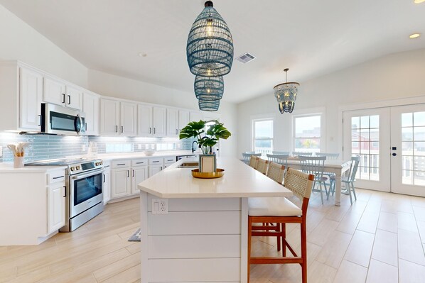 Inside, the heart of the home is the fully equipped kitchen, a chef's dream boasting stainless steel appliances and ample counter space for culinary creations. Gather around the spacious dining area for meals together, or take your dining experience outdoors to savor the fresh coastal air.