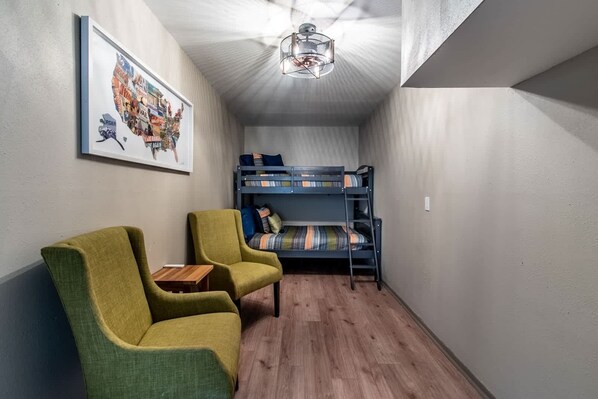Venture left through the kitchen to discover a half bath, a dedicated entertainment room with a ping pong table, and a quiet bedroom adorned with a queen bed and a bunk bedroom. For your convenience, a washer and dryer are located in the garage adjacent to the entertainment room. Enjoy limitless fun with our arcade machine, set to free play for both kids and adults, no quarters required!