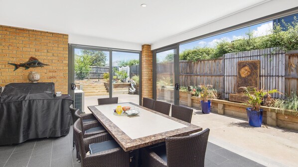 Das Anwesen besteht aus zwei modernen Bädern und verfügt über einen großen überdachten Außenbereich, der auch an kühleren Tagen und Nächten für Unterhaltung und Grillvergnügen perfekt ist.