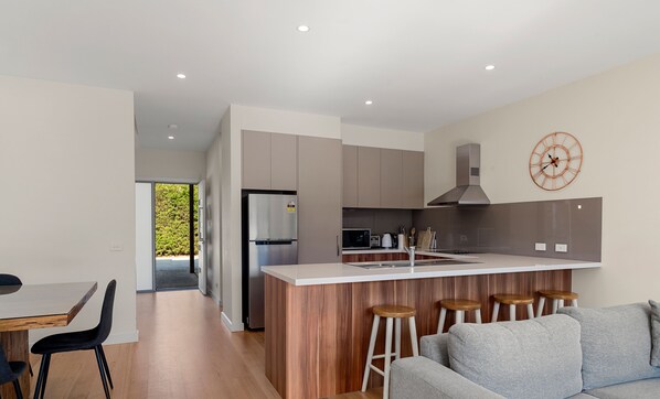 Entertain family and friends on the private deck with alfresco dining, or choose the 8 seat square flint dining table in the warm and spacious open dining area.