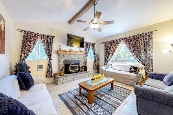 Upon entering this beautifully designed and appointed home, you will first encounter a family room and living area, both furnished with comfortable sofas. The first space would be ideal for family gatherings and to plan your next adventures, while the living space would be perfect for gatherings that include streaming everyone's favorite series or movies on the smart TV with cable or playing board games while the wood-burning fireplace keeps everyone nice and warm during the winter months. On the opposite side of this level is the fully appointed, eat-in kitchen with wonderful appliances that will make cooking a breeze and a six-person dining table. From here guests can easily access the back patio and the pantry with a washer/dryer. A full bathroom with a standalone shower can be found on this level as well.