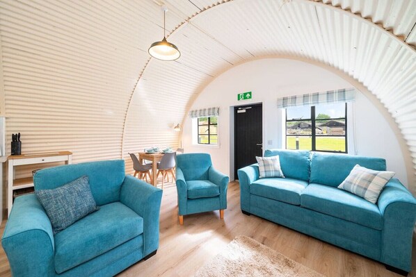 Every building tells a story and this one certainly has a rich history! Hut 37 is one of five beautifully modernised and renovated Nissen huts that are part of the former Cultybraggan Prisoner of War Camp, just a mile outside the picturesque village of Comrie.This hut accepts one well behaved dog. Cultybraggan have requested that dogs need to be on a lead at all times while on site and not allowed on sofas or bedsNissen huts were commonly used in PoW camps across Britain during World War Ii. While they were only intended to be temporary, Cultybraggan Camp lived on after the war as a Mod training centre for more than 70 years. It’s now the last remaining Prisoner of War Camp in Scotland and has been named by Historic Scotland as a Unique Heritage Asset of International Value.Thanks to the vision of the Comrie Development Trust, which now owns the camp, five Nissen huts have been transformed into spacious, sustainable and modern self-catering accommodation. They’re ideal whether you’re a keen history buff or simply want a truly unique stay in the Perthshire countryside.While the huts retain their iconic external design, they’ve all been given a major facelift with a bright red roof, crisp white exterior front wall, and black door and window trim, providing an Insta-worthy contrast to the vivid greens of the surrounding Aberuchill Hills. Inside, Hut 37 has been completely transformed with a spacious open plan living room, fully-equipped kitchen and dining space, full of natural light. Blond wooden floors, cream interior walls, pale furniture tones and the white cabinetry of the kitchen add to the sense of space and calm. There’s comfortable seating including a sofa bed and television for when it`s time to relax, plus a dining table with seating for 4.The separate bedroom contains a king size bed, and there’s also a modern separate bathroom with a shower.Key Features Fully modernised, renovated huts.1 bedroom - 1 x King & 1 x Double Sofa Bed 1 modern main shower room.Open plan kitchen and lounge areaDining table that seats 4Fully equipped Kitchen Situated within the former prison of war camp.LocationCultybraggan Camp is situated two miles outside the picturesque village of Comrie, in the heart of Perthshire. The Camp, which belongs to the Comrie Development Trust, is home to local businesses and community groups. You can learn about the history of the camp at the informative PoW exhibition, which includes a recreation of prisoner accommodation.Take a visit to Comrie village where you’ll find local shops and places to eat, with more options a little further along in the larger town of Crieff.Comrie is a great base for exploring all the delights of Perthshire. Families will love a trip to Auchingarrich Wildlife Centre, set in the Perthshire hills, home to a variety of exotic and more familiar wildlife. Golfers are spoilt for choice with lots of quality local courses, or the famous Gleneagles is just half an hour’s drive away. It’s a walker’s paradise with options at all levels, from the Glenlendock Circular Walk that starts in Comrie, the popular and wheelchair-friendly Lady Mary’s Walk at Crieff, to the mighty Munros of Ben Vorlich, Stuc a Chorin and Ben Chonzie.Welcome to Cultybraggan Camp, enjoy this unique stay!Just a quick heads-up: there`s a cattle grid at the entrance of the camp. Since we`ve got a bunch of small business outlets here, you might spot some vehicles coming and going in the early mornings and late evenings.