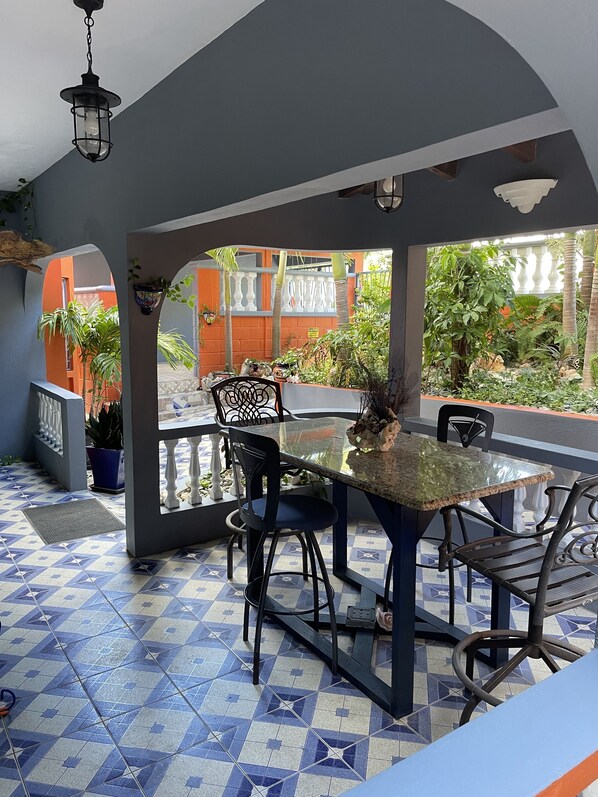 Es hat einen eigenen Eingang mit Balkon. Hohe Deckenventilatoren, Klimaanlage. Kleiderschrank, Kommode, Nachttische, Bügeleisen und Bügelbrett, Kofferständer und vieles mehr.