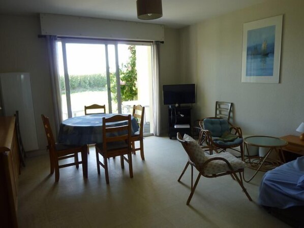 Located on the garden level of a small building facing the beach, this apartment can sleep 6 people. It is composed of a living room (TV) with kitchen area (fridge, freezer, oven, hob, microwave), an alcove (160 bed), a bedroom (140 + 2x90 bunk beds), bathroom water (washing machine, dryer) with WC. The bay window in the living room gives access to a private terrace.