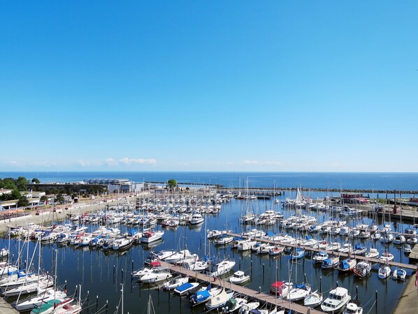 "Ostsee-Residenz (DMP153)", 2-Zimmer-Wohnung 45 m2 im 7. Stock. Gemütlich eingerichtet: Wohn-/Schlafzimmer mit 1 Doppeldiwanbett (160 cm, Länge 200 cm), Esstisch, Sat-TV, Radio und CD. Ausgang zum Balkon. 1 Zimmer mit 2 Betten und Sat-TV. Offene Küche (Backofen, Geschirrspüler, 4 Glaskeramikplatten, Toaster, Wasserkocher, Mikrowelle, elektrische Kaffeemaschine). Dusche/WC. Balkonmöbel, Abstellkammer. Sehr schöne Sicht auf das Meer und den Hafen. Zur Verfügung: Kinderhochstuhl, Babybett. Internet (WLAN, gratis). Bitte beachten: Nichtraucher-Unterkunft. Maximal 1 Haustier/Hund erlaubt. Rauchmelder, Feuerlöscher.
