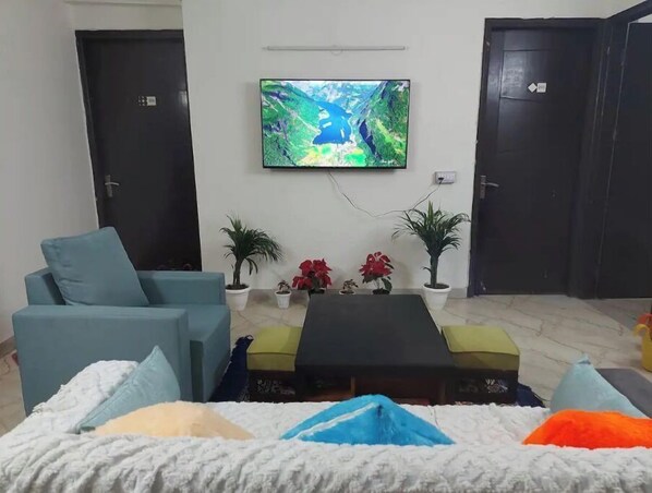 This stylish room in our 4BHK apartment is quite spacious and perfect stay option for couples, families or professionals visiting amazing Delhi. The location is just 1.7 Km from Saket Metro Station and has close proximity to famous touristic sites such as Qutub Minar, Hauz Khas Village, Garden of five senses and Mehrauli. Guests can access common kitchen to cook anything they want. We provide basic Masalas and oils needed. Guests are required to buy veggies and other stuff as they need.