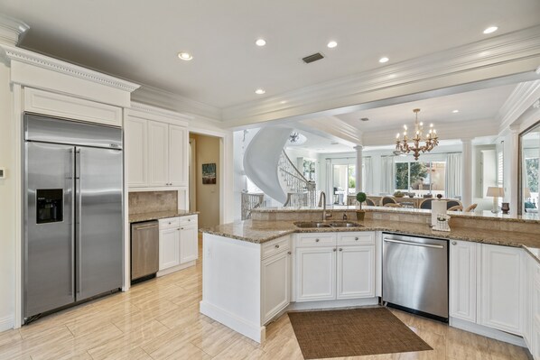 You’ll find three bedrooms and a lovely morning kitchen on the first floor. Two bedrooms feature queen-sized beds, while a third houses two twin bunks, a great spot the kids will love. The sweeping wrought iron staircase, an architectural delight, connects all three floors, the second floor featuring spacious and bright rooms that seamlessly connect indoor and outdoor spaces. Catch gorgeous sunsets with family and friends on the massive private balcony with plenty of room for everyone to spread out. Prepare delightful meals or snacks for the pool in the fully appointed gourmet kitchen filled with upgraded appliances and a breakfast bar with seating for four. Two king-size master suites with king-sized beds and a private balcony await on the third floor guaranteeing everyone a good night’s sleep. You’ll also find a washer and dryer for added convenience.