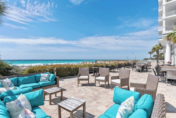 The gulf front Inn at Crystal Beach resort complex offers direct beach access too! Head out of the condo and straight out into the private sandy beach!