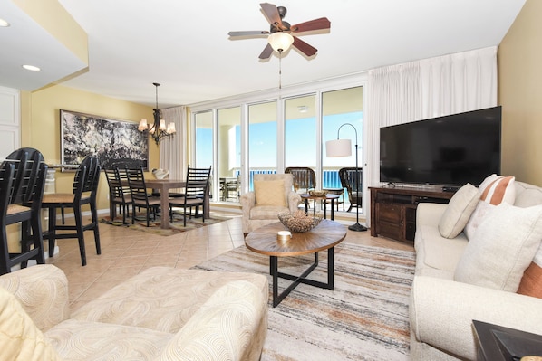 Es wäre so einfach, das Gepäck fallen zu lassen und sich für ein oder zwei Stunden auf dem Hauptbalkon zu parken, um die ersten Sonnenstrahlen Floridas zu genießen, aber der Luxus dieser Wohnung wird Sie für einige Erkundungstouren zurück ins Haus locken! Der offene Wohnbereich ist geräumig und komfortabel und der perfekte Ort, um mit Ihrer Familie und Freunden nach langen Tagen am Strand oder nach Erkundungstouren in Destin zu entspannen. Angrenzend an den Wohnbereich befindet sich das Esszimmer und die Frühstücksbar, die beide einen Blick auf den Golf bieten und geräumig und komfortabel genug sind, um Ihre ganze Familie unterzubringen, falls Sie lieber drinnen als auf dem Balkon speisen möchten. Die Küche enthält Marmorplatten und ist voll ausgestattet mit allem, was Sie brauchen, um unvergessliche Mahlzeiten mit Ihrer Familie zuzubereiten und zu genießen. Die Waschküche enthält eine Waschmaschine und einen Trockner in voller Größe und befindet sich direkt neben der Küche.