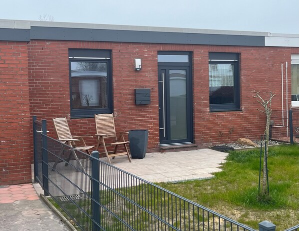 Moderner komfortabler Ferienbungalow in erster Reihe hinter dem Deich. Sandstrand, beheiztes Meerwasserschwimmbad, Fischereihafen, Skaterbahn, Reethaus mit Spielscheune und Kurpark sind nur fünf Gehminuten entfernt.