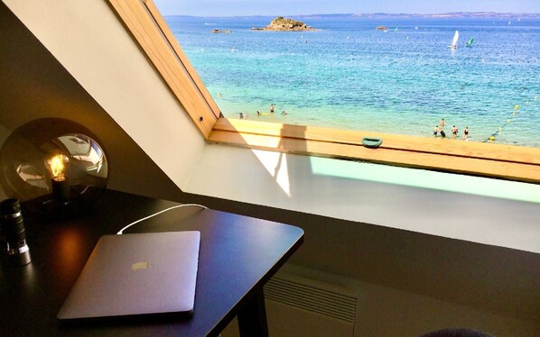 • Cozy living area upstairs on the mezzanine equipped with an additional sofa bed and a reading/working corner with sea view.