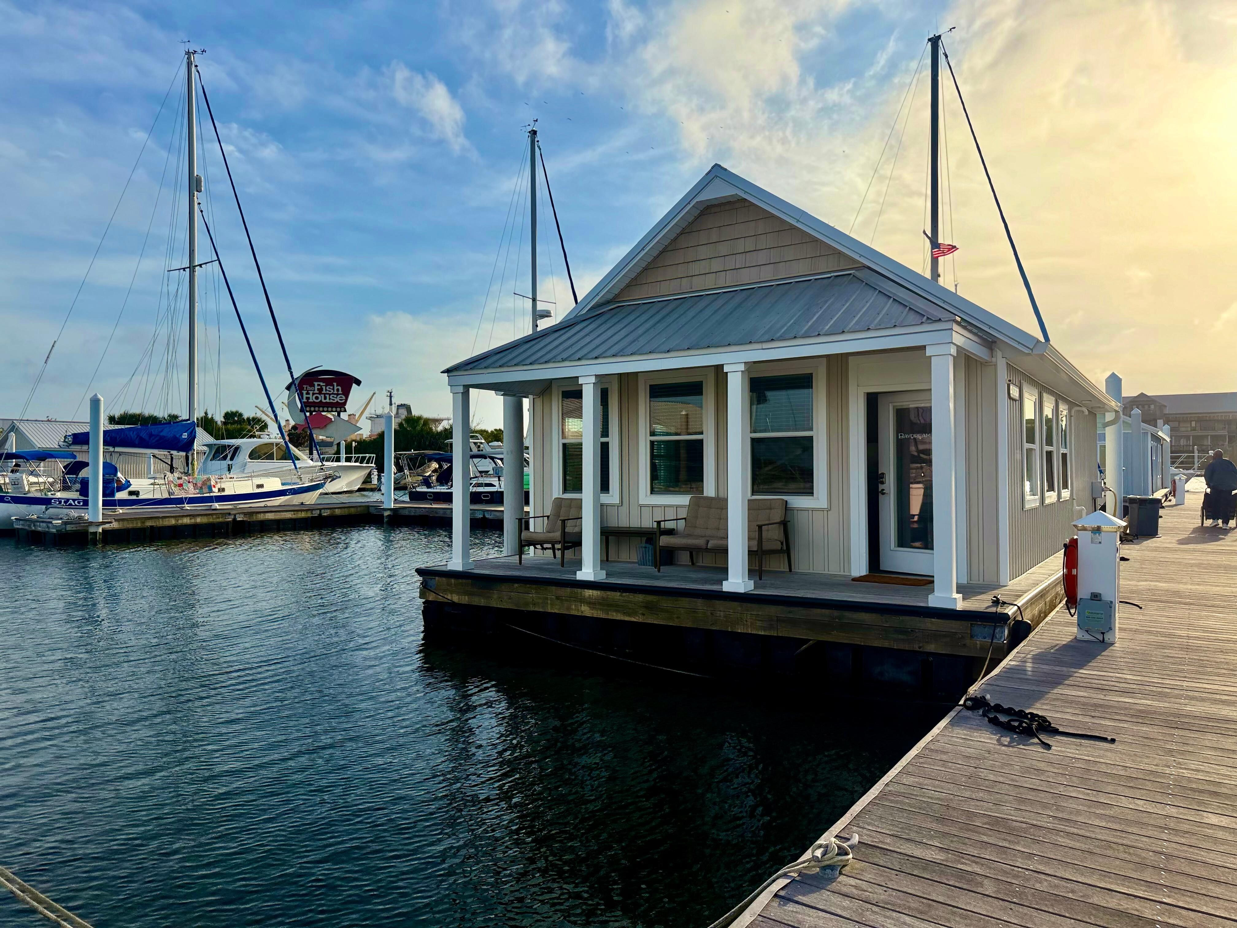 We really enjoyed staying in this boat house. It was very clean and we were able to park our boat right next to it. It was nice having a washer/dryer in the unit. Two restaurants are on site- Fish House and Atlas Oyster Bar. Both were great.We planned our trip with boating in mind. We trailered our 20’ boat to Pensacola and unloaded it at the Mahogany Mill boat ramp. It’s a free boat ramp 10 minutes away and pretty nice. It has a wash down hose on site. We parked our SUV and boat trailer there for most of our stay. The house boat owners will allow you to park your boat trailer at the marina for the first or last night of your stay, but any longer and they ask you to store it at their off site storage facility nearby. Since we were only there three nights, we chanced it and left our suv/trailer at the boat ramp and either walked or took our boat. We loaded our luggage onto the boat before splashing it so it was easy to transfer to the house. On our last day, we loaded the boat and took it over to the marina. They allowed me to wash and flush the boat at the end of the cul-de-sac by the marina office and then park it in the back of the adjacent gravel lot. They have dock carts you can use to ferry your luggage from the parking lot if need be. It is 100 yard walk from the entrance gate to the unit. To us it wasn’t a big deal, but I’d recommend checking the weather and bring a rain jacket so you don’t get soaked walking to the unit. For boating, this place is ideal.
