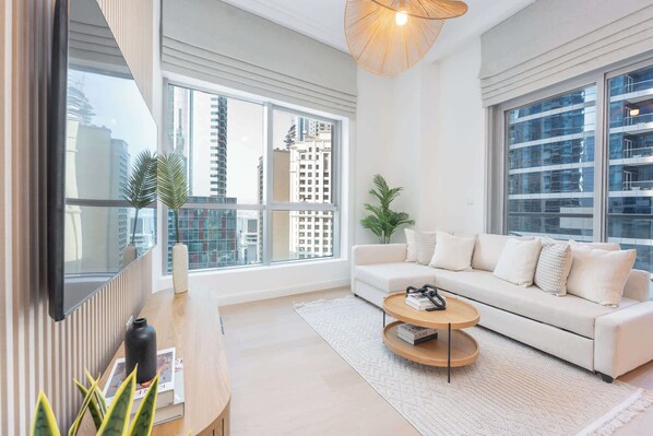 The apartment offers a spacious open-plan dining and sitting area with smart TV, ideal for unwinding after a day at JBR beach. Step out onto the balcony to enjoy stunning views and savour your morning coffee while taking in the marina views.