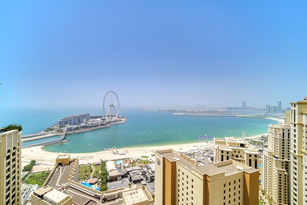Our stylish apartment, a vacation home in the heart of a fantastic community with man-made lake views, is not only elegant on the inside, but also on the lifestyle that awaits outside. Living in JBR is all about vibrancy, with a plethora of alfresco eateries, world-class retail outlets, and easy access to main roadways. Thanks to its well-lit interiors and elegant prints, the property exudes flair and relaxation. The marble dining table gives off a rich vibe. The assigned vanity dresser in each bedroom gives the community's gorgeous view, which may be appreciated even more from the balcony.