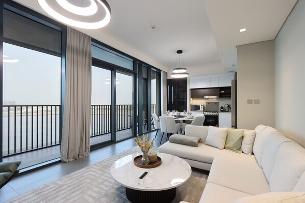 A spacious open-plan living room with plush seating, smart TV, and floor-to-ceiling windows opens onto a wide balcony with sweeping views over the water and Dubai skyline.